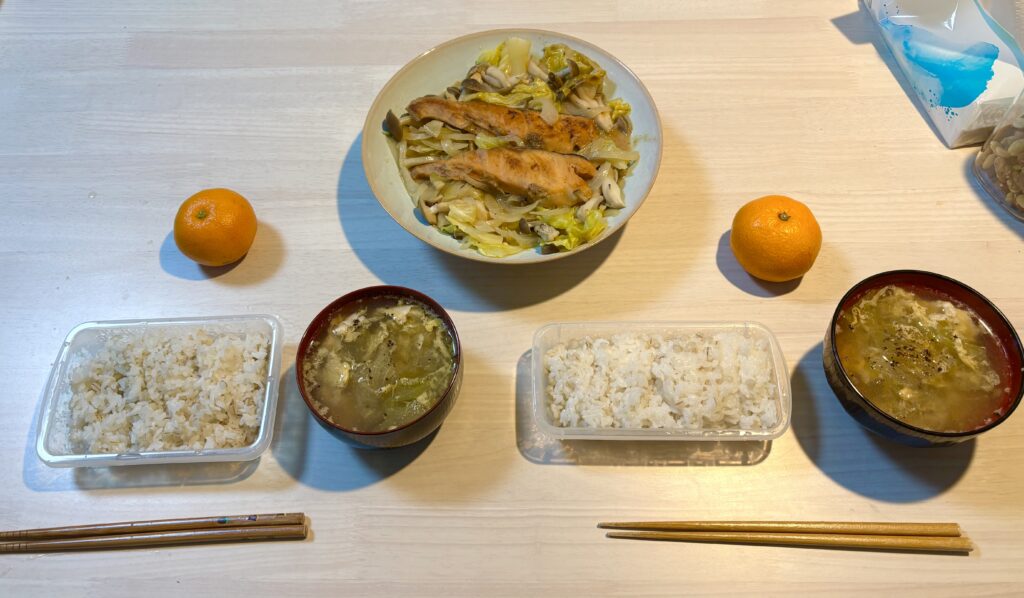 上の画像はちゃんちゃん焼きとレタスの卵とじスープです。