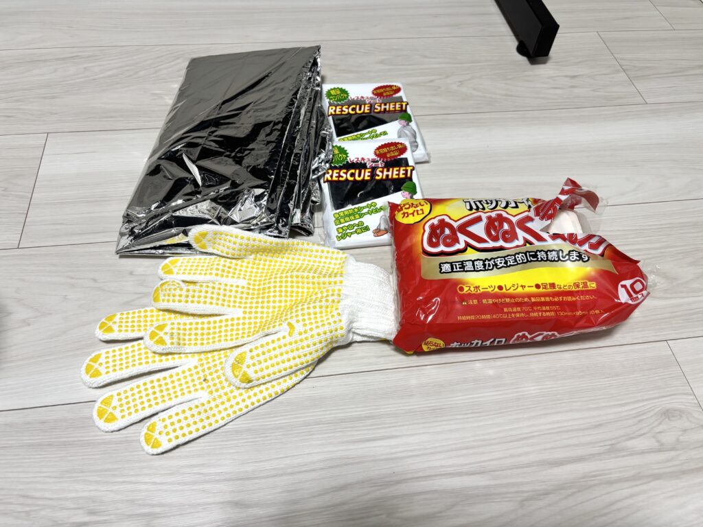 体を暖めるものはカイロや着替え類ですが、暖め過ぎても汗をかきむしろ体温を奪ってしまうため、注意が必要みたいです。汗をかいた場合には体温を下げないために着替えが必要だと思いました。(着替え類は写真には写ってません。)