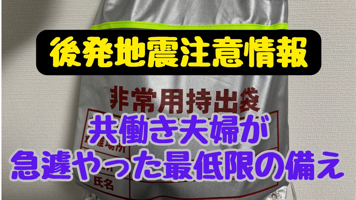 普段から災害に備えて備蓄をしてますが、今回の後発地震情報では「巨大地震が発生する可能性が高まっている」ため、避難をすることも想定して、今まできちんと用意できていなかった非常持ち出し袋を今回用意しました。