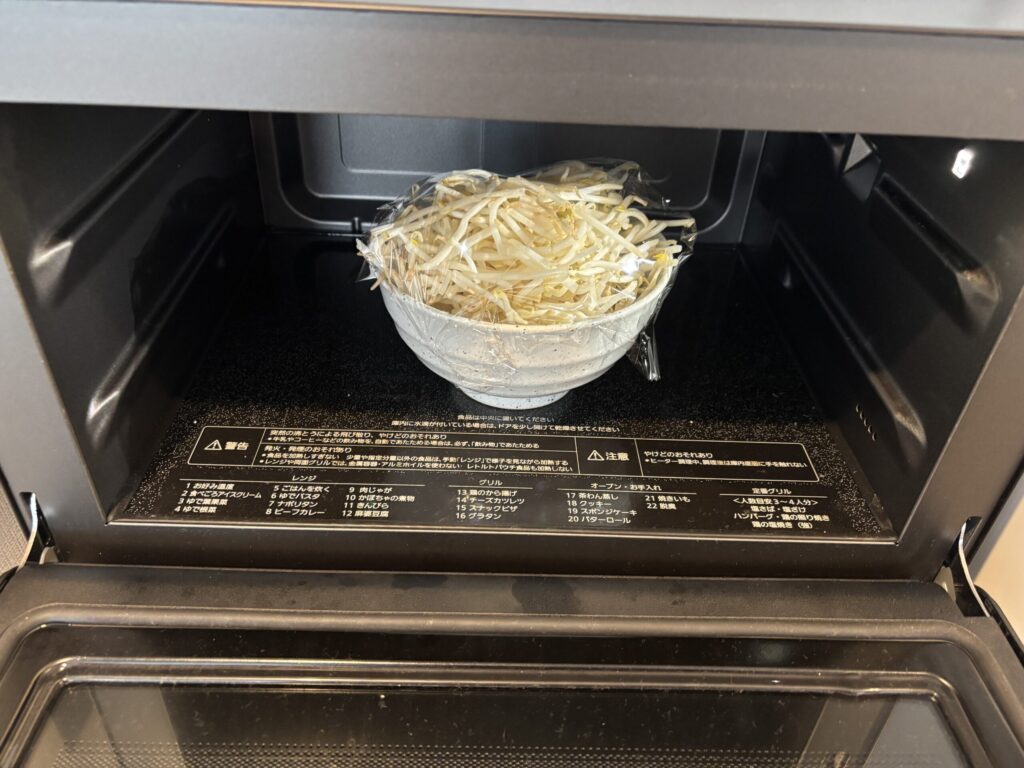 上の写真は、電子レンジを使ってもやしのナムルを作っている様子です。