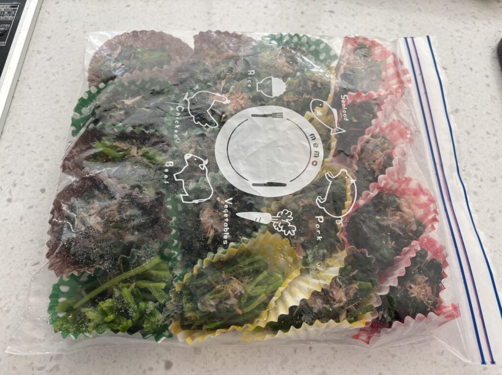 この写真は、ほうれん草をおひたしをジップロックに入れて冷凍する様子です。