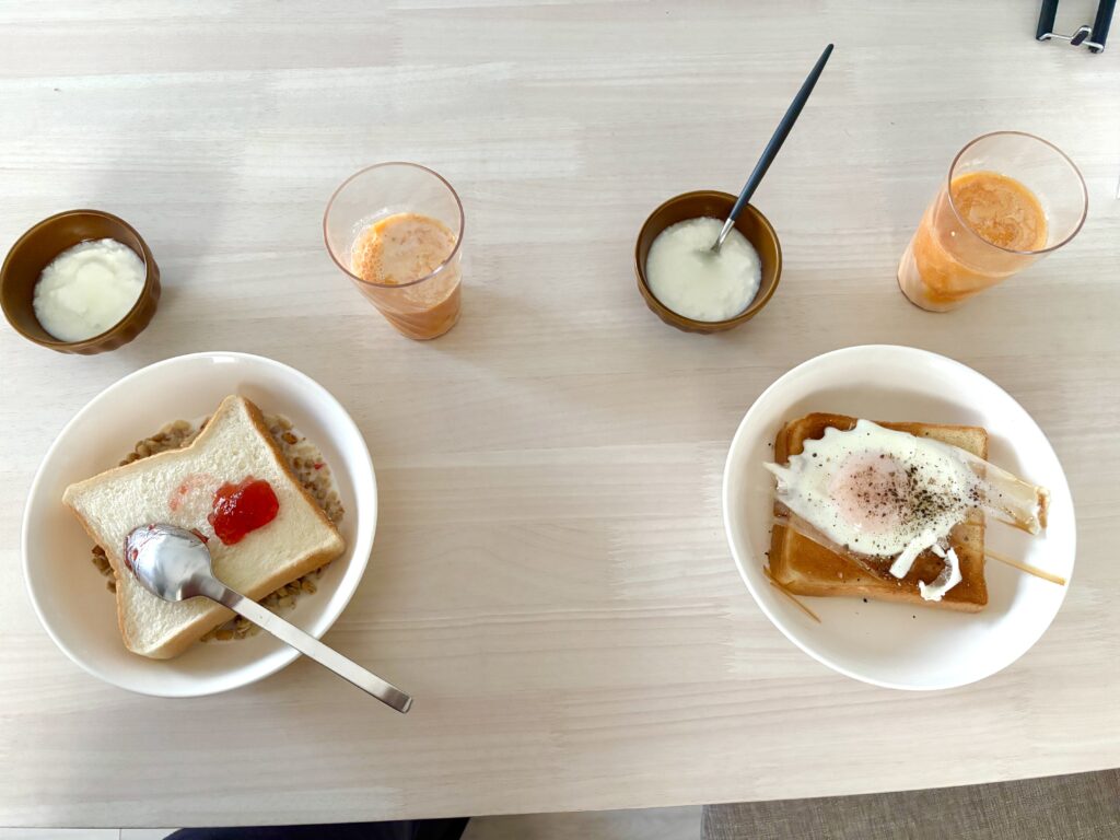 (妻)食パン、目玉焼き、野菜ジュース豆乳ミックス、ヨーグルト
