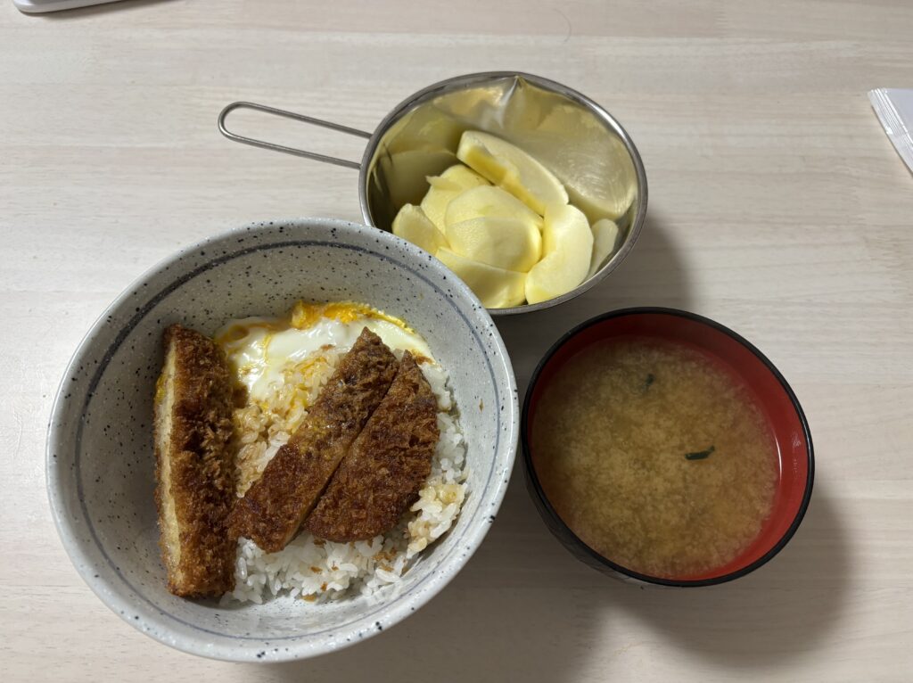 • 夜:お惣菜のチキンカツを使ったかつ丼、レトルト味噌汁、リンゴ