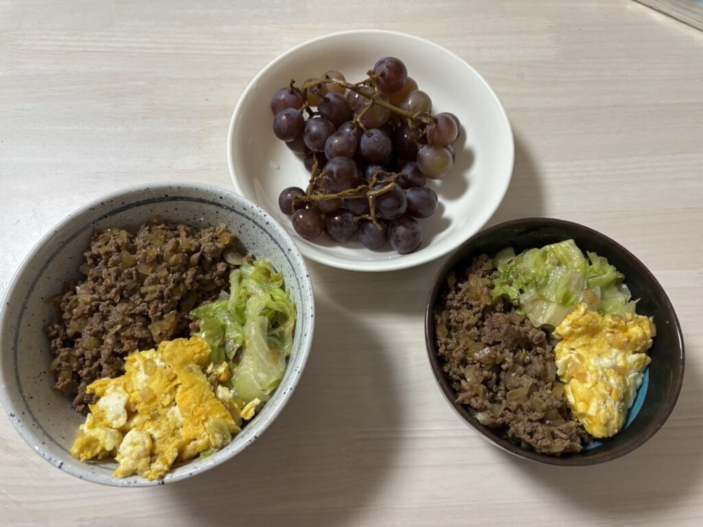 • 夜:豚肉とキャベツと玉ねぎの炒め物、レトルト味噌汁、納豆、ぶどう