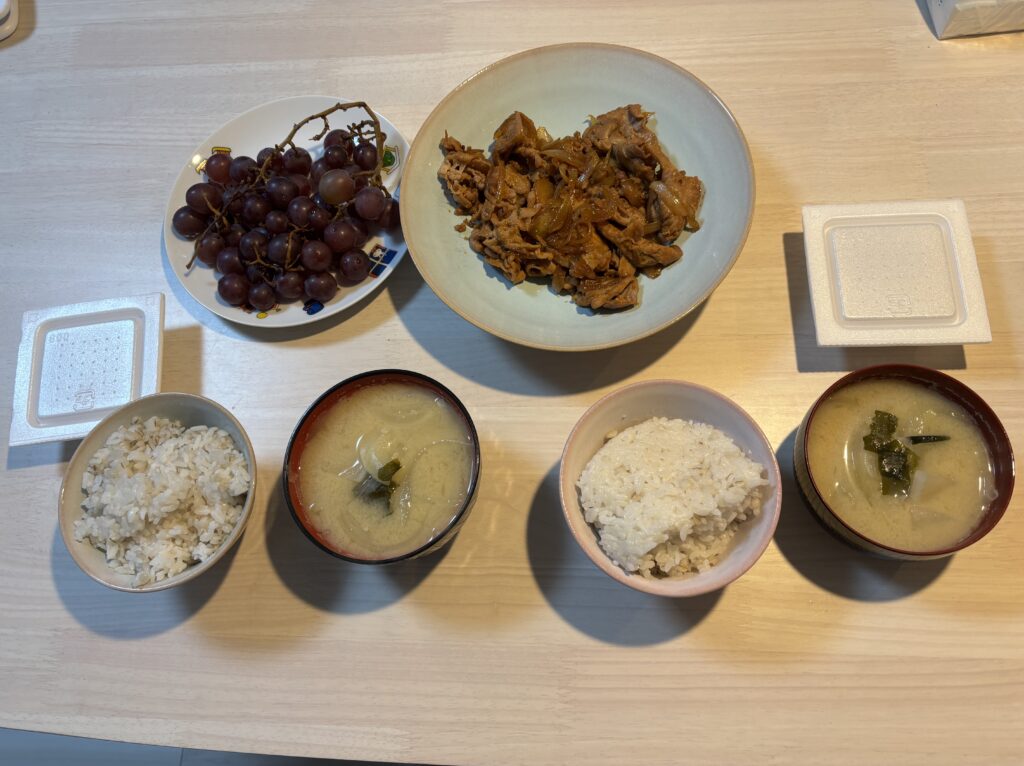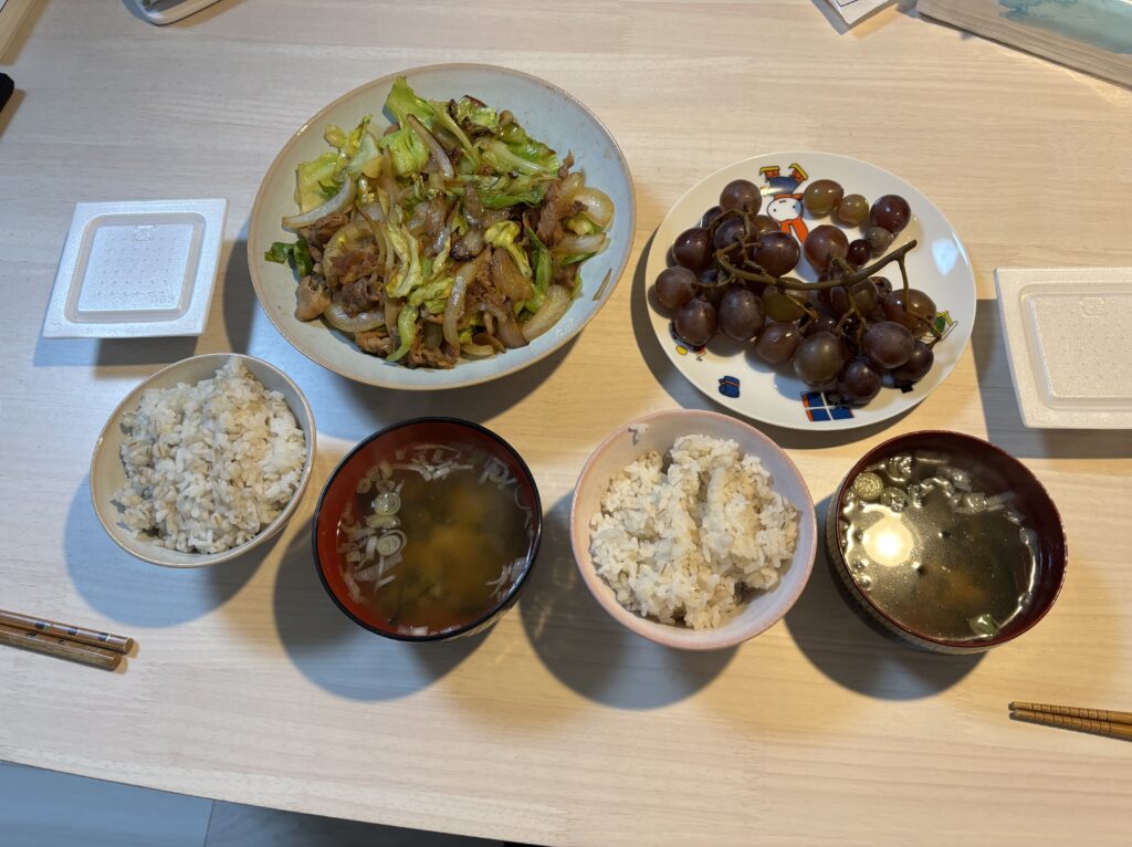 • 夜:豚肉と玉ねぎの炒め物、大根とわかめの味噌汁、納豆、ぶどう